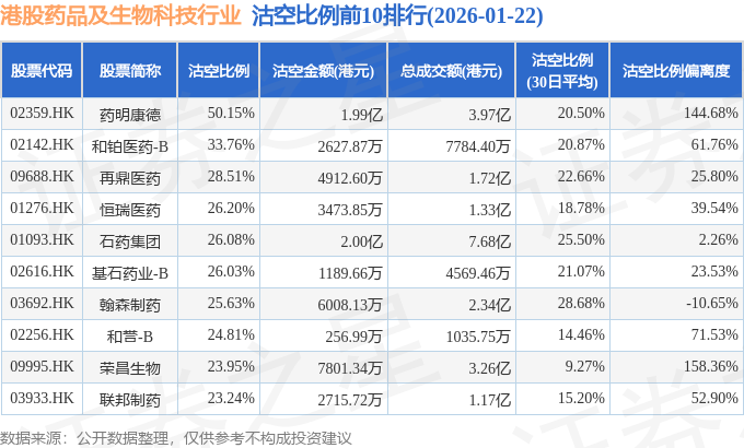 从沽空比例来看,药明康德、和铂医药-B、再鼎医药沽空比例位居行业前三,分别为50.15%、33.76%、28.51%。
