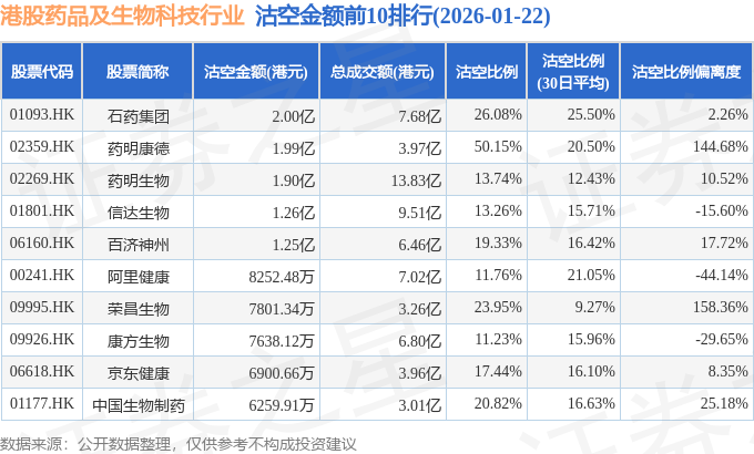 从沽空金额来看,石药集团、药明康德、药明生物沽空金额位居行业前三,分别为2亿港元、1.99亿港元、1.9亿港元。