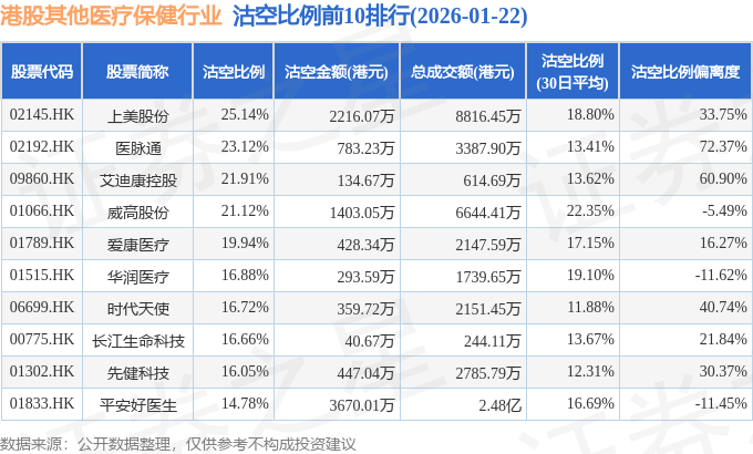 证券之星消息,1月22日港交所披露数据显示,当日港股其他医疗保健行业的126只个股中有35只被沽空,总沽空股数为1874.97万股,总沽空金额为2.23亿元(港元),而当日其他医疗保健行业的总成交金额为32.39亿元(港元),沽空比例为6.88%。当日其他医疗保健行业总体跌0.3%。