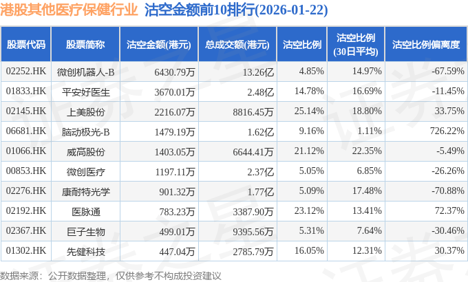 从沽空金额来看,微创机器人-B、平安好医生、上美股份沽空金额位居行业前三,分别为6430.79万港元、3670.01万港元、2216.07万港元。