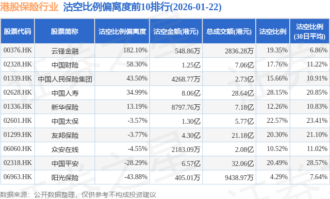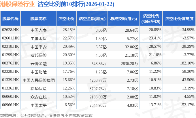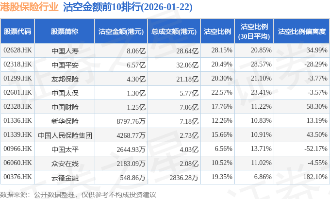 从沽空金额来看,中国人寿、中国平安、友邦保险沽空金额位居行业前三,分别为8.06亿港元、6.57亿港元、4.3亿港元。