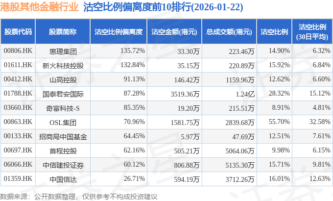 从沽空比例偏离度来看,惠理集团、新火科技控股、山高控股沽空比例偏离度位居行业前三,分别为135.72%、132.84%、91.13%。