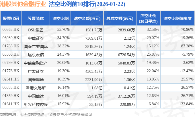 从沽空比例来看,OSL集团、中信证券、国泰君安国际沽空比例位居行业前三,分别为55.7%、34.7%、28.32%。