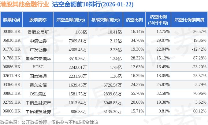 证券之星消息,1月22日港交所披露数据显示,当日港股其他金融行业的178只个股中有39只被沽空,总沽空股数为5121.77万股,总沽空金额为4.69亿元(港元),而当日其他金融行业的总成交金额为32.94亿元(港元),沽空比例为14.24%。当日其他金融行业总体跌0.2%。