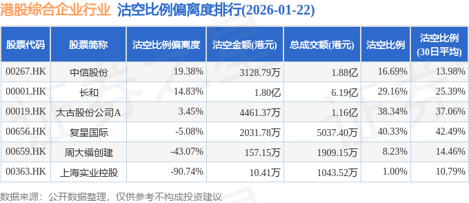 从沽空比例偏离度来看,中信股份、长和、太古股份公司A沽空比例偏离度位居行业前三,分别为19.38%、14.83%、3.45%。