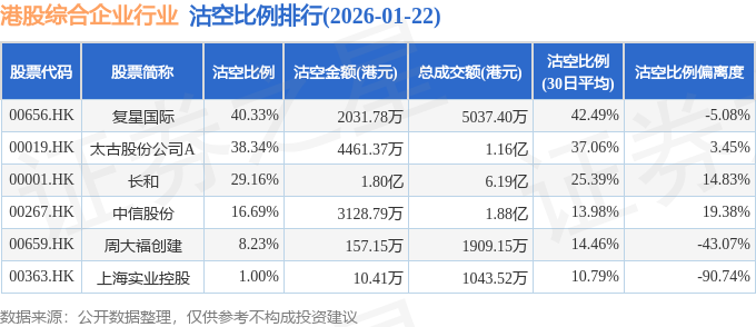 从沽空比例来看,复星国际、太古股份公司A、长和沽空比例位居行业前三,分别为40.33%、38.34%、29.16%。