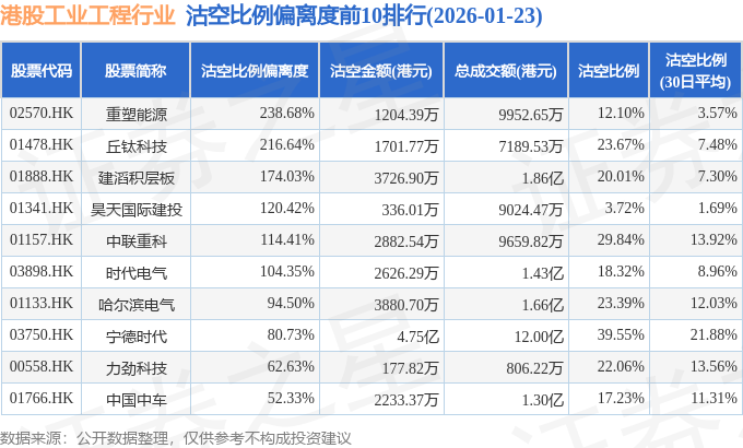 从沽空比例偏离度来看,重塑能源、丘钛科技、建滔积层板沽空比例偏离度位居行业前三,分别为238.68%、216.64%、174.03%。