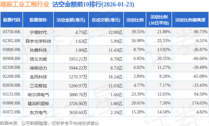 从沽空金额来看,宁德时代、舜宇光学科技、协鑫科技沽空金额位居行业前三,分别为4.75亿港元、1.62亿港元、1亿港元。