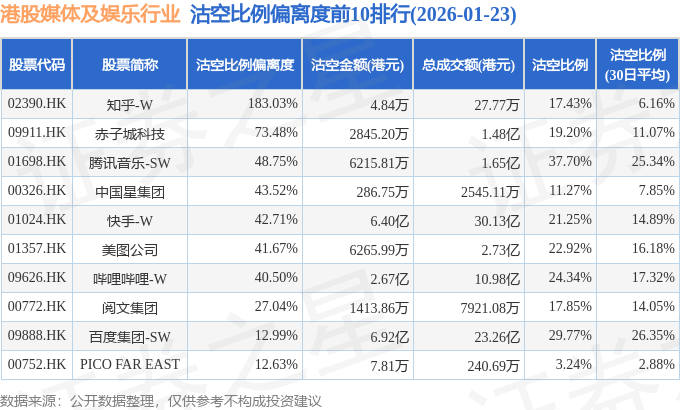 从沽空比例偏离度来看,知乎-W、赤子城科技、腾讯音乐-SW沽空比例偏离度位居行业前三,分别为183.03%、73.48%、48.75%。
