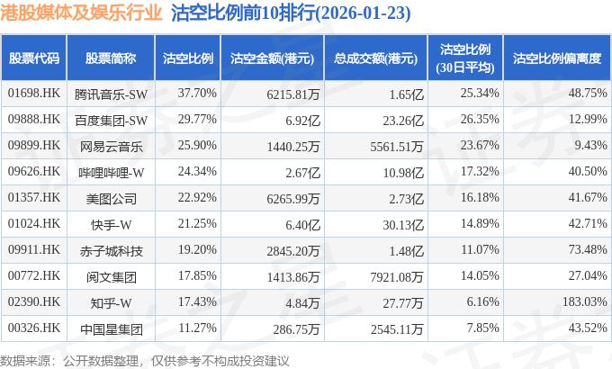 从沽空比例来看,腾讯音乐-SW、百度集团-SW、网易云音乐沽空比例位居行业前三,分别为37.7%、29.77%、25.9%。