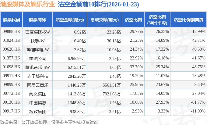 从沽空金额来看,百度集团-SW、快手-W、哔哩哔哩-W沽空金额位居行业前三,分别为6.92亿港元、6.4亿港元、2.67亿港元。