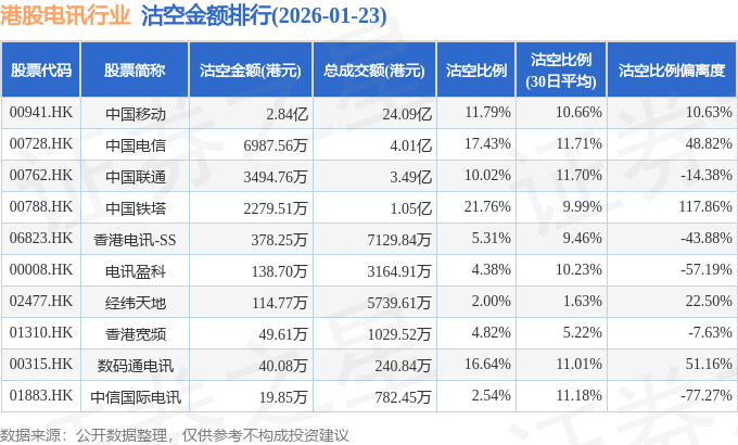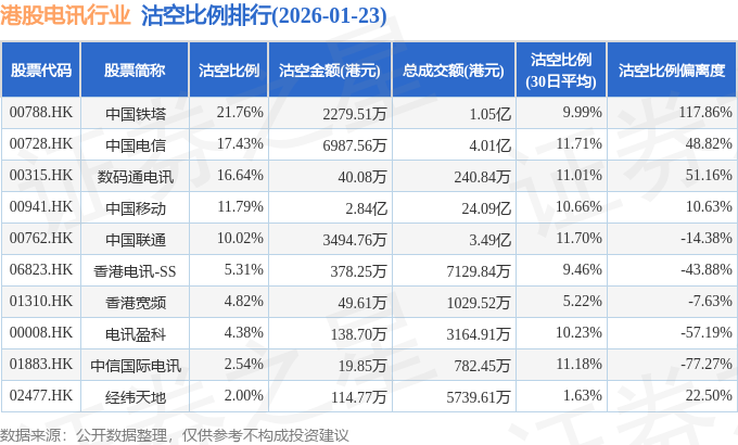 从沽空比例来看,中国铁塔、中国电信、数码通电讯沽空比例位居行业前三,分别为21.76%、17.43%、16.64%。