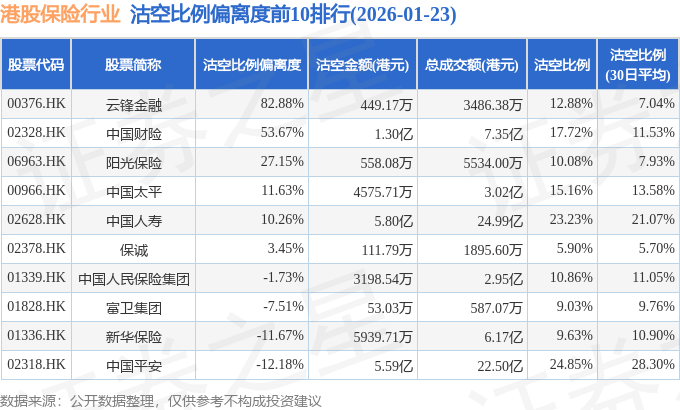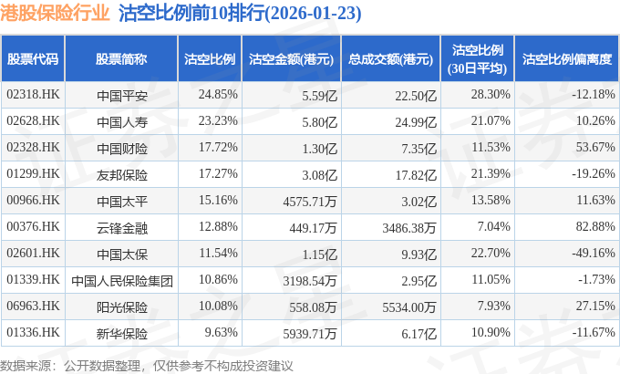 从沽空金额来看,中国人寿、中国平安、友邦保险沽空金额位居行业前三,分别为5.8亿港元、5.59亿港元、3.08亿港元。