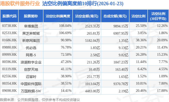 从沽空比例偏离度来看,阜博集团、黑芝麻智能、新意网集团沽空比例偏离度位居行业前三,分别为108.04%、106.69%、90.98%。