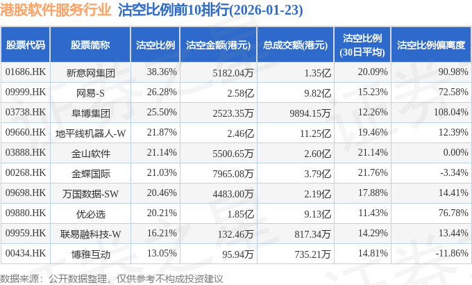 从沽空比例来看,新意网集团、网易-S、阜博集团沽空比例位居行业前三,分别为38.36%、26.28%、25.5%。