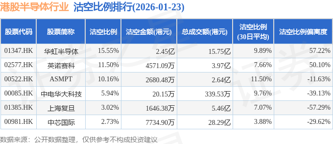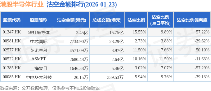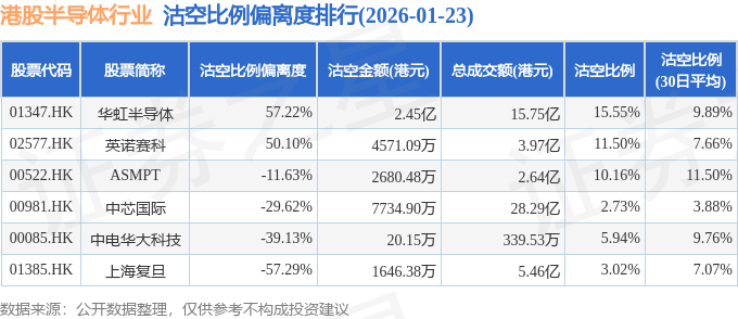 从沽空比例偏离度来看,华虹半导体、英诺赛科、ASMPT沽空比例偏离度位居行业前三,分别为57.22%、50.1%、-11.63%。