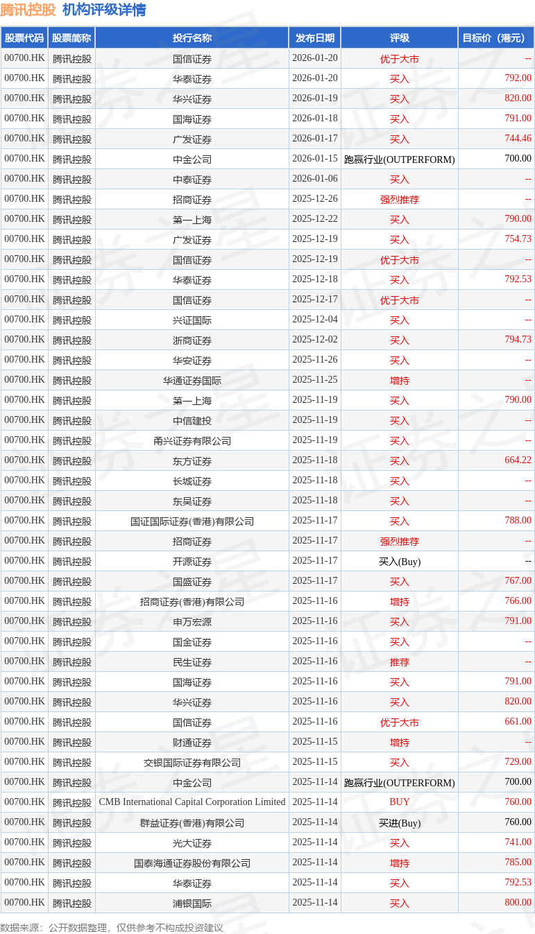 投行对该股的评级以买入为主,近90天内共有27家投行给出买入评级,近90天的目标均价为764.82港元。国信证券最新一份研报给予腾讯控股优于大市评级。