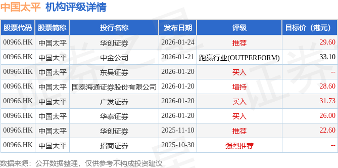 投行对该股的评级以买入为主,近90天内共有3家投行给出买入评级,近90天的目标均价为28.61港元。华创证券最新一份研报给予中国太平推荐评级,目标价29.6港元。