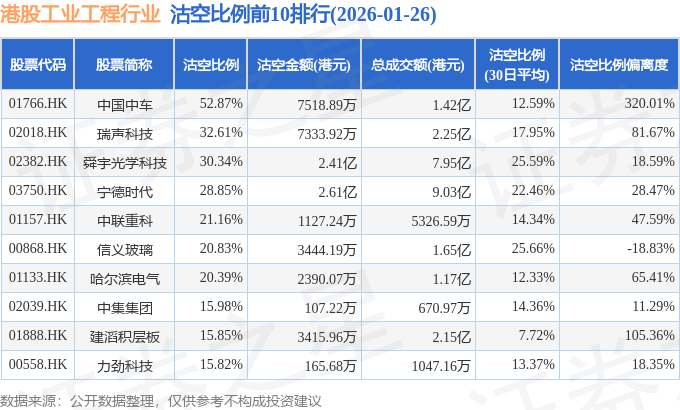 从沽空比例偏离度来看,中国中车、中环新能源、建滔积层板沽空比例偏离度位居行业前三,分别为320.01%、211.52%、105.36%。