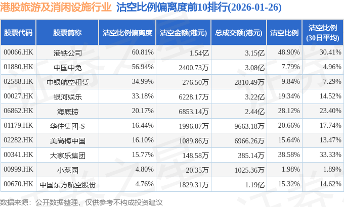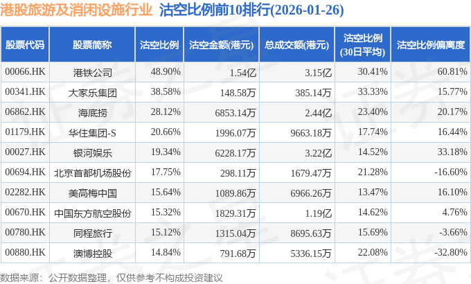 由于港股人民币柜台交易股票成交金额较小,沽空比例普遍偏高,为了避免干扰,已将人民币柜台交易股票从排行表格中剔除。