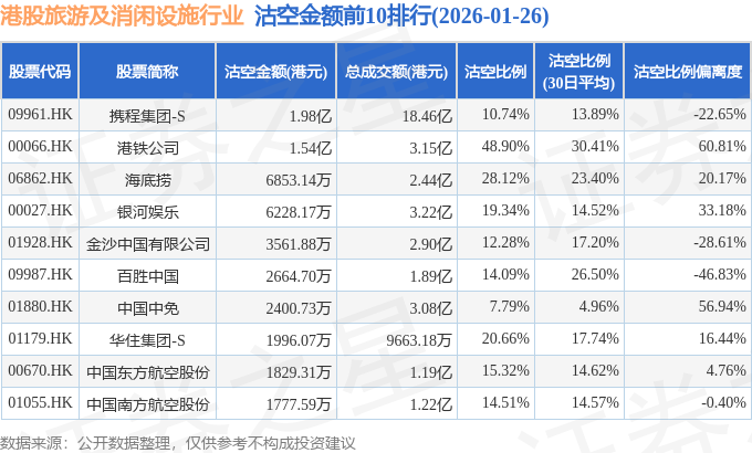 从沽空金额来看,携程集团-S、港铁公司、海底捞沽空金额位居行业前三,分别为1.98亿港元、1.54亿港元、6853.14万港元。