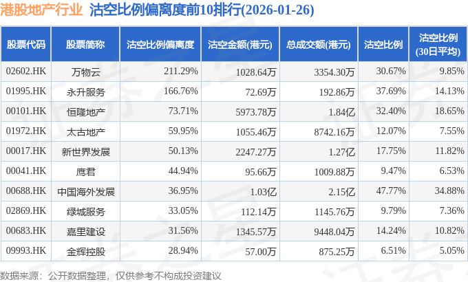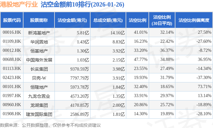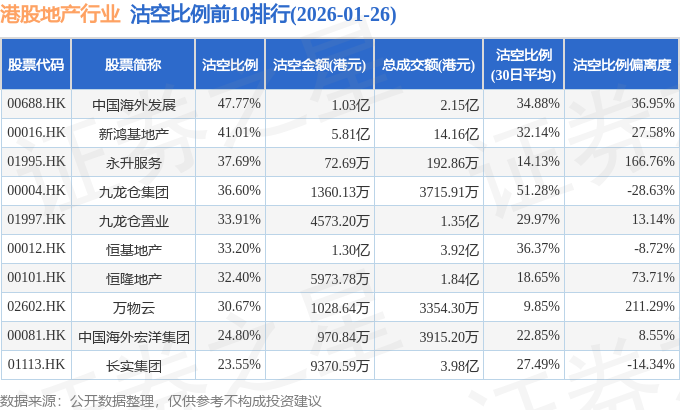 从沽空比例来看,中国海外发展、新鸿基地产、永升服务沽空比例位居行业前三,分别为47.77%、41.01%、37.69%。