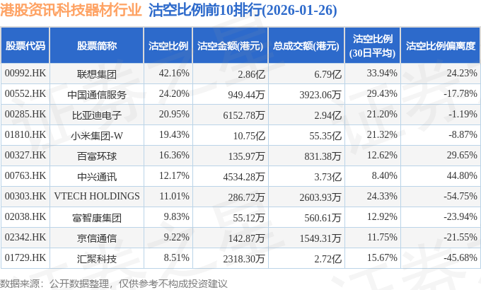 从沽空比例来看,联想集团、中国通信服务、比亚迪电子沽空比例位居行业前三,分别为42.16%、24.2%、20.95%。