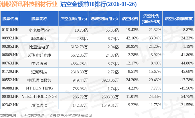 从沽空金额来看,小米集团-W、联想集团、比亚迪电子沽空金额位居行业前三,分别为10.75亿港元、2.86亿港元、6152.78万港元。