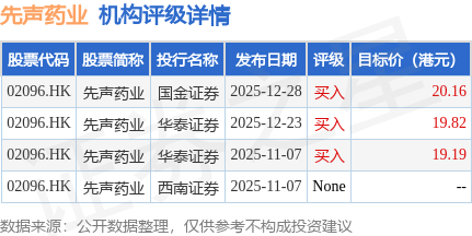 截至2026年1月27日收盘,先声药业(02096.HK)报收于11.94港元,上涨2.23%,成交量520.35万股,成交额6215.26万港元。投行对该股的评级以买入为主,近90天内共有3家投行给出买入评级,近90天的目标均价为19.72港元。国金证券最新一份研报给予先声药业买入评级,目标价20.16港元。