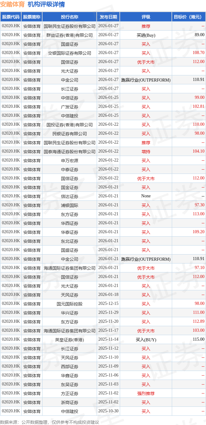 投行对该股的评级以买入为主,近90天内共有30家投行给出买入评级,近90天的目标均价为106港元。国联民生证券股份有限公司最新一份研报给予安踏体育推荐评级。