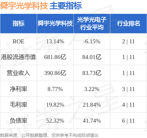 舜宇光学科技港股市值681.86亿港元,在光学光电子行业中排名第1。主要指标见下表: