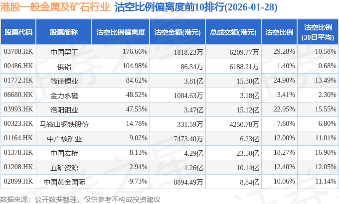从沽空比例偏离度来看,中国罕王、俄铝、赣锋锂业沽空比例偏离度位居行业前三,分别为176.66%、104.98%、84.62%。