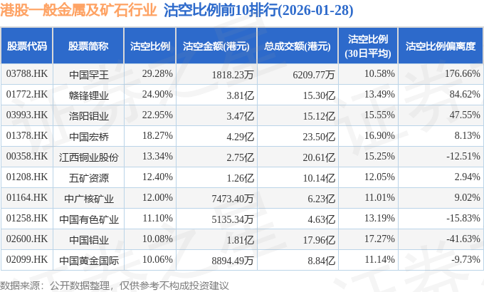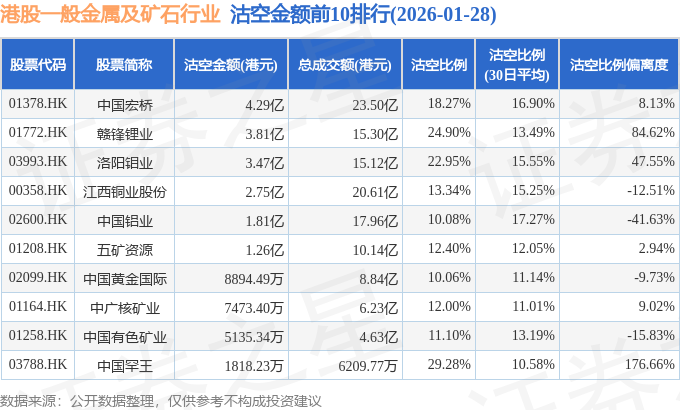 从沽空金额来看,中国宏桥、赣锋锂业、洛阳钼业沽空金额位居行业前三,分别为4.29亿港元、3.81亿港元、3.47亿港元。