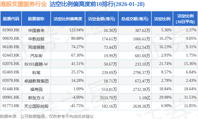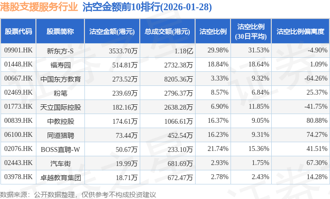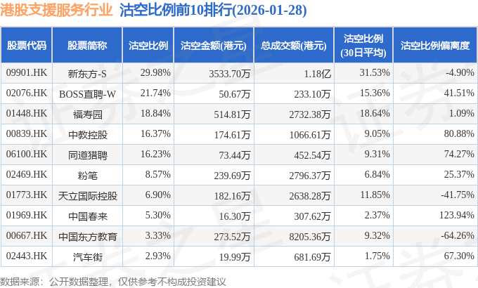 从沽空比例来看,新东方-S、BOSS直聘-W、福寿园沽空比例位居行业前三,分别为29.98%、21.74%、18.84%。