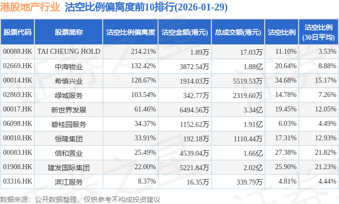 从沽空比例偏离度来看,TAI CHEUNG HOLD、中海物业、希慎兴业沽空比例偏离度位居行业前三,分别为214.21%、132.42%、128.67%。