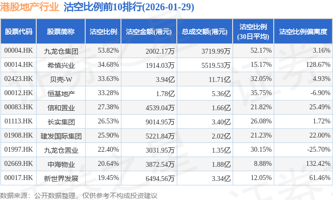 从沽空比例来看,九龙仓集团、希慎兴业、贝壳-W沽空比例位居行业前三,分别为53.82%、34.68%、33.63%。