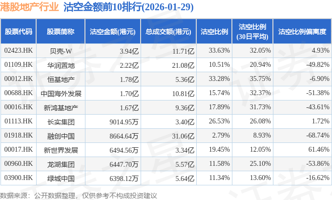 从沽空金额来看,贝壳-W、华润置地、恒基地产沽空金额位居行业前三,分别为3.94亿港元、2.22亿港元、1.78亿港元。
