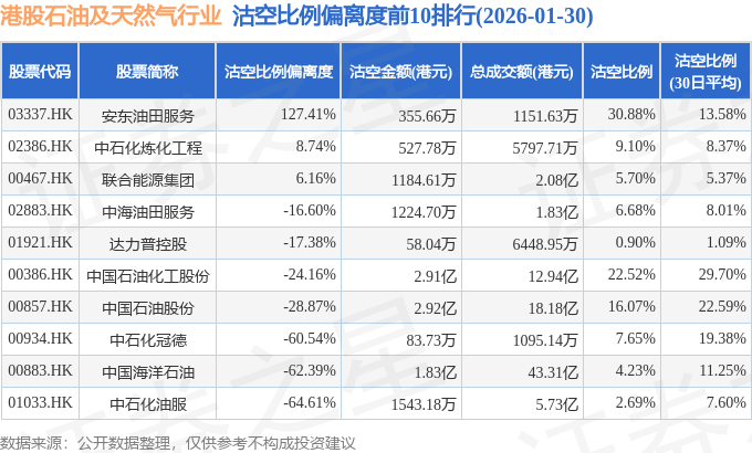 从沽空比例偏离度来看,安东油田服务、中石化炼化工程、联合能源集团沽空比例偏离度位居行业前三,分别为127.41%、8.74%、6.16%。