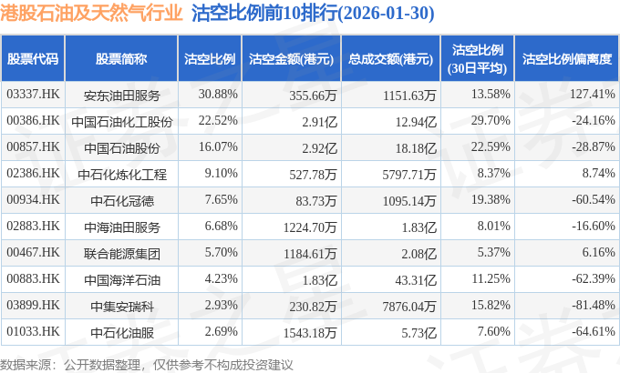 从沽空金额来看,中国石油股份、中国石油化工股份、中国海洋石油沽空金额位居行业前三,分别为2.92亿港元、2.91亿港元、1.83亿港元。