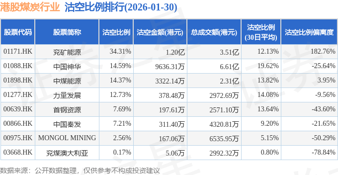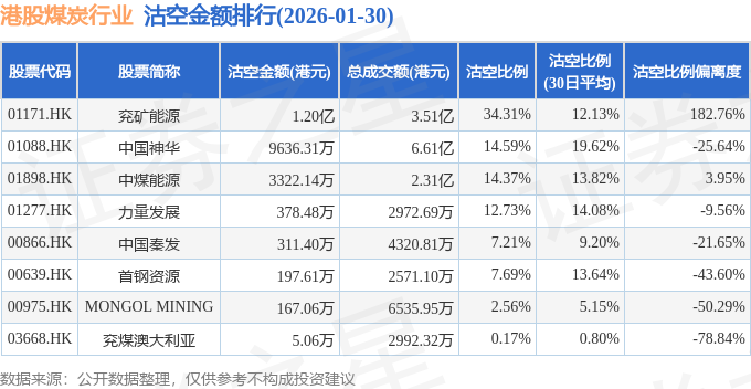 从沽空比例偏离度来看,兖矿能源、中煤能源、力量发展沽空比例偏离度位居行业前三,分别为182.76%、3.95%、-9.56%。