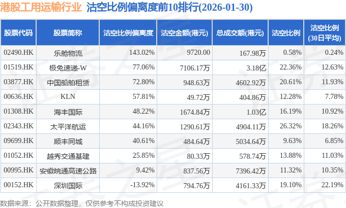 从沽空比例偏离度来看,乐舱物流、极兔速递-W、中国船舶租赁沽空比例偏离度位居行业前三,分别为143.02%、77.06%、72.8%。
