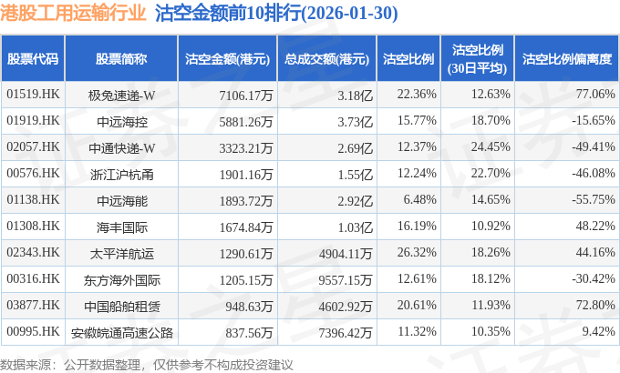 从沽空金额来看,极兔速递-W、中远海控、中通快递-W沽空金额位居行业前三,分别为7106.17万港元、5881.26万港元、3323.21万港元。