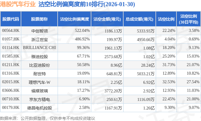 从沽空比例偏离度来看,中创智领、浙江世宝、BRILLIANCE CHI沽空比例偏离度位居行业前三,分别为522.04%、486.92%、99.36%。