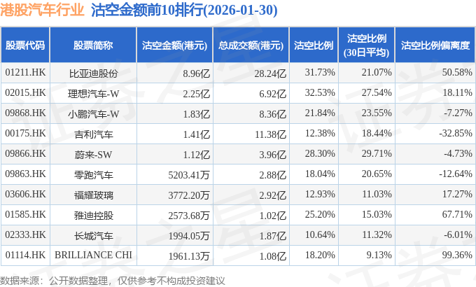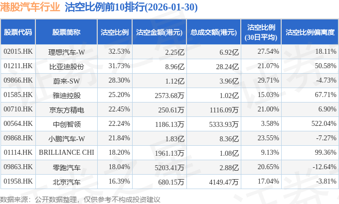 从沽空金额来看,比亚迪股份、理想汽车-W、小鹏汽车-W沽空金额位居行业前三,分别为8.96亿港元、2.25亿港元、1.83亿港元。