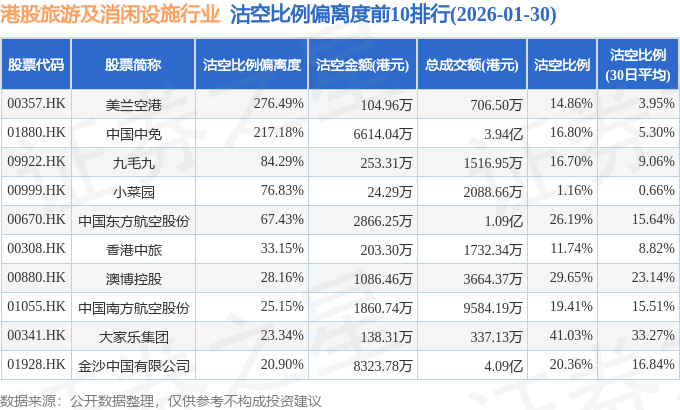 从沽空比例偏离度来看,美兰空港、中国中免、九毛九沽空比例偏离度位居行业前三,分别为276.49%、217.18%、84.29%。