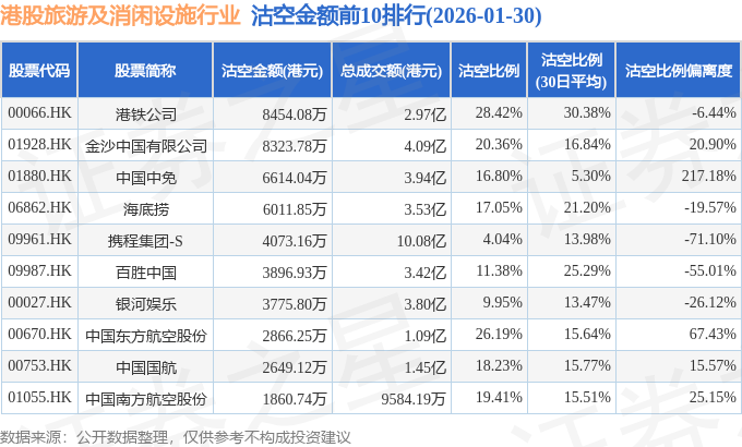 从沽空金额来看,港铁公司、金沙中国有限公司、中国中免沽空金额位居行业前三,分别为8454.08万港元、8323.78万港元、6614.04万港元。