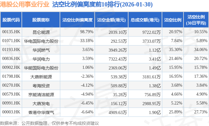 从沽空比例偏离度来看,昆仑能源、华电国际电力股份、华润燃气沽空比例偏离度位居行业前三,分别为98.79%、33.18%、3.65%。