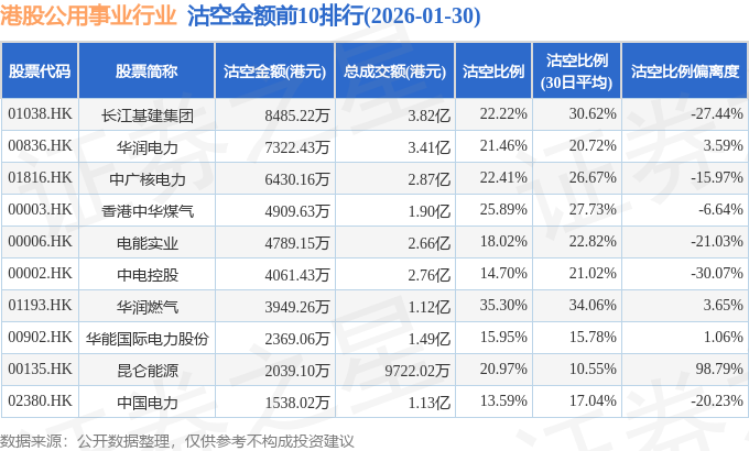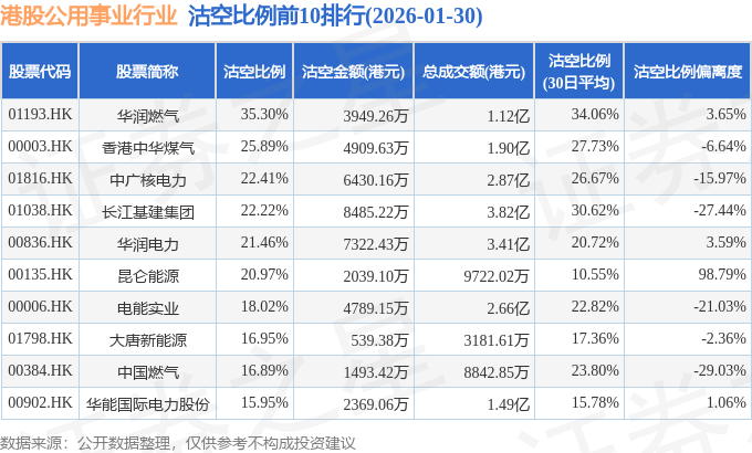 从沽空比例来看,华润燃气、香港中华煤气、中广核电力沽空比例位居行业前三,分别为35.3%、25.89%、22.41%。