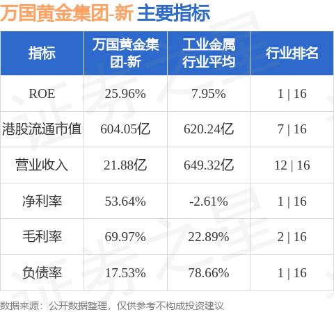 万国黄金集团-新港股市值604.05亿港元,在工业金属行业中排名第7。主要指标见下表: