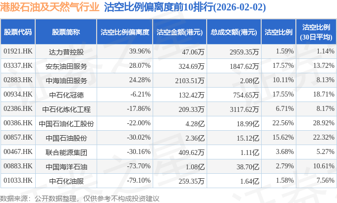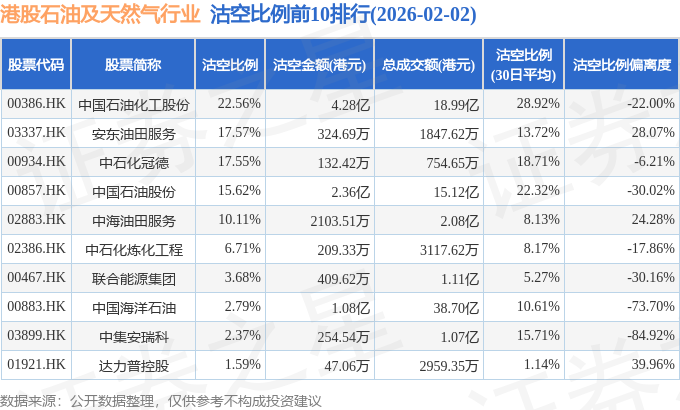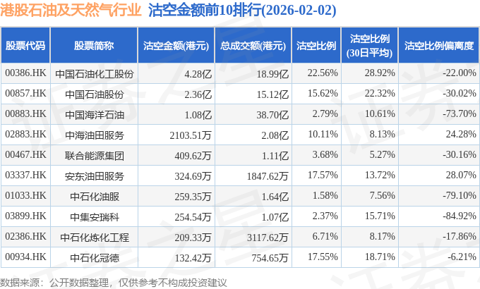 从沽空金额来看,中国石油化工股份、中国石油股份、中国海洋石油沽空金额位居行业前三,分别为4.28亿港元、2.36亿港元、1.08亿港元。